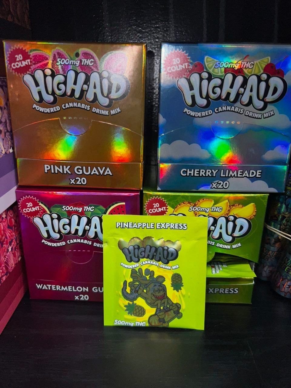 High Aid is a high-potency cannabis-infused beverage containing a total of 500 milligrams of THC. It is formulated for measured dosing, allowing users to control their intake more easily. Rather than consuming a full edible at once, users can sip gradually, adjusting the experience to match their comfort level.
